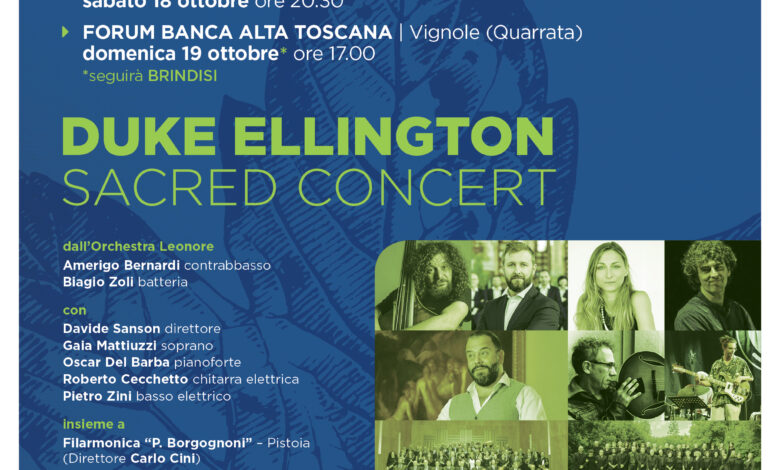 Un grande evento di anteprima segna lโavvio di questa nuova edizione di Floema, con lโesecuzione del Sacred Concert di Duke Ellington, nella celebre versione da concerto Hรธybye/Pedersen per soprano, coro misto e big band, sabato 18 ottobre (ore 20.30) al Teatro Manzoni di Pistoia e, domenica 19 ottobre, al Forum Banca Alta Toscana di Vignole – Quarrata (ore 17, brindisi a seguire).