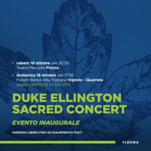 Un grande evento di anteprima segna lโavvio di questa nuova edizione di Floema, con lโesecuzione del Sacred Concert di Duke Ellington, nella celebre versione da concerto Hรธybye/Pedersen per soprano, coro misto e big band, sabato 18 ottobre (ore 20.30) al Teatro Manzoni di Pistoia e, domenica 19 ottobre, al Forum Banca Alta Toscana di Vignole – Quarrata (ore 17, brindisi a seguire).