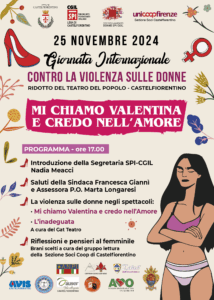 “Come tutti gli anni – sottolinea Daniela Cipollini – lo SPI CGIL lega Castelfiorentino, con Unicoop Firenze e tante altre associazioni – partecipa con piacere alla organizzazione della giornata internazionale contro la violenza sulle donne. E’ importante intervenire su una piaga sociale che purtroppo non accenna a diminuire dando il nostro contributo con questi eventi e tenere alta l’attenzione sul problema, consapevoli che oltre alla sensibilizzazione servirebbe un intervento educativo e culturale rivolto alle giovani generazioni a tutela delle donne”