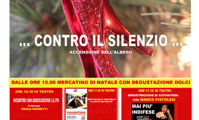Le iniziative promosse in occasione della Giornata Internazionale contro la violenza sulle donne proseguiranno l’8 dicembre al Teatro di Castelnuovo d’Elsa con la serata “Contro il silenzio”, che prevede alle 16.30 un incontro con l’associazione Lilith (intervento di Paola Rossetti), alle 17.00 lo spettacolo teatrale “Valentina” a cura di Gatteatro, e infine alle 17.30 una dimostrazione di autodifesa con Marco Pistolesi. A segure accensione dell’albero e aperitivo.