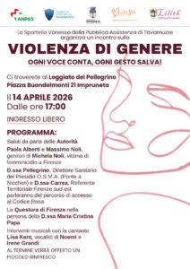 Impruneta (Firenze) 9 aprile 2026 | Il Comune di Impruneta informa che lo Sportello Vanessa della Pubblica Assistenza di Tavarnuzze organizza un incontro dedicato al tema della violenza di genere, con l’obiettivo di promuovere consapevolezza e strumenti di prevenzione. L’iniziativa, dal titolo “Ogni voce conta, ogni gesto salva”, si terrà martedì 14 aprile 2026, a partire dalle ore 17:00, presso il Loggiato del Pellegrino, in Piazza Buondelmonti 21 a Impruneta. L’ingresso è libero.