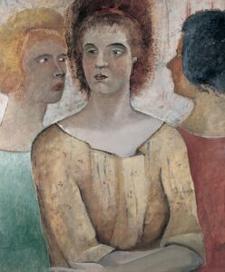 Un aspetto distintivo della mostra alla Galleria Comunale è la stretta relazione con l’antico. La Galleria infatti si situa di fianco alla Chiesa di San Francesco, che custodisce il ciclo di affreschi delle Storie della Vera Croce di Piero della Francesca, ed è significativo sottolineare i rapporti tra le figure rappresentate da Marino e quelle del grande artista rinascimentale. In tal senso, va evidenziata la presenza del dipinto Le vergini del 1916 e la Zuffa di Cavalieri del 1927 ca., quest’ultimo messo a disposizione dalle Gallerie degli Uffizi di Firenze, che evocano le celebri composizioni di Piero della Francesca all’interno dell’attigua Cappella Bacci. In mostra, poi, vengono esposte per la prima volta, accanto ad alcune sculture arcaiche di Marino, le sculture ellenistiche in terracotta rinvenute durante gli scavi della Catona ad Arezzo (che l’artista vide pubblicate nel 1920 sulla rivista “Dedalo”, tra le più importanti pubblicazioni di critica d’arte dell’epoca, diretta da Ugo Ojetti) provenienti dal Museo Archeologico Nazionale Gaio Cilnio Mecenate.
