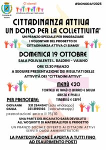 Il progetto “Cittadinanza attiva – Ci siamo!” è attivo a Vaiano dalla primavera 2025 e conta già oltre 80 volontari suddivisi in tre gruppi operativi a Vaiano, Sofignano e La Briglia. Si tratta di un’iniziativa regolata da un apposito patto di collaborazione tra Comune e cittadini volontari, che garantisce anche la copertura assicurativa per i partecipanti. Dall’avvio ha realizzato quasi un centinaio di interventi concreti, dalla pulizia di aree verdi al restauro di arredi urbani, dalla manutenzione di spazi pubblici all’affiancamento durante eventi culturali e scolastici. Tra i più recenti, quelli sulla scuola dell’infanzia della Tignamica e della primaria alla Briglia.
