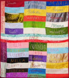 Le bandiere delle mezzadre fiorentine – Nel 1952, dalla rivista “Le nostre lotte”, le donne della CGIL lanciarono la proposta di una prima Conferenza nazionale della donna lavoratrice. Nel corso del 1953 si svolsero le assemblee territoriali e delle federazioni sindacali. Fu in questa occasione che le mezzadre della provincia di Firenze realizzarono la loro gigantesca bandiera, che oggi potremmo definire una “installazione site specific” di tipo politico. Lunga 7,8 metri e alta 2,4, la bandiera venne esposta per la prima volta all’Assise provinciale delle mezzadre di Firenze il 29 marzo 1953 e successivamente portata all’Assise nazionale di Siena del 18-19 marzo 1953.