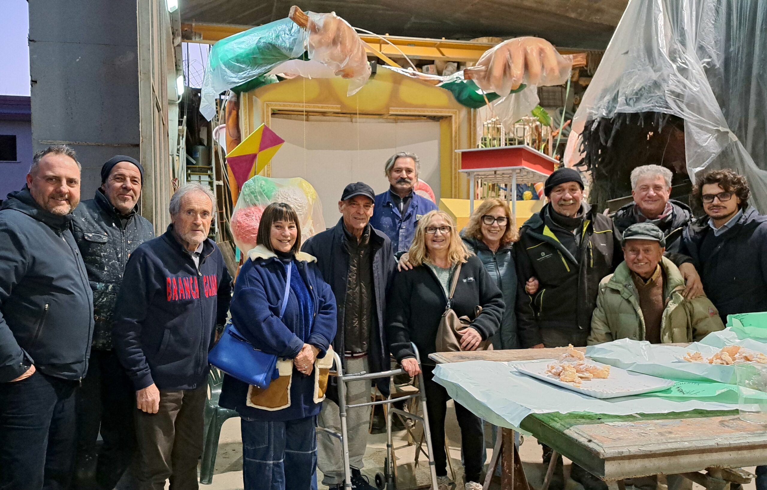 Un saluto con brindisi e… chiacchiere (intese come dolce tipico di Carnevale) insieme alle dieci contrade del Carnevale di Pietrasanta, nell’antivigilia dell’attesissimo esordio sul circuito cittadino: l’ha organizzato l’amministrazione comunale che, con la presidente delle giurie Franca Dini, nel pomeriggio di venerdì ha portato il canonico “in bocca al lupo” agli hangar dove si stanno apportando gli ultimi controlli e ritocchi alle costruzioni allegoriche.