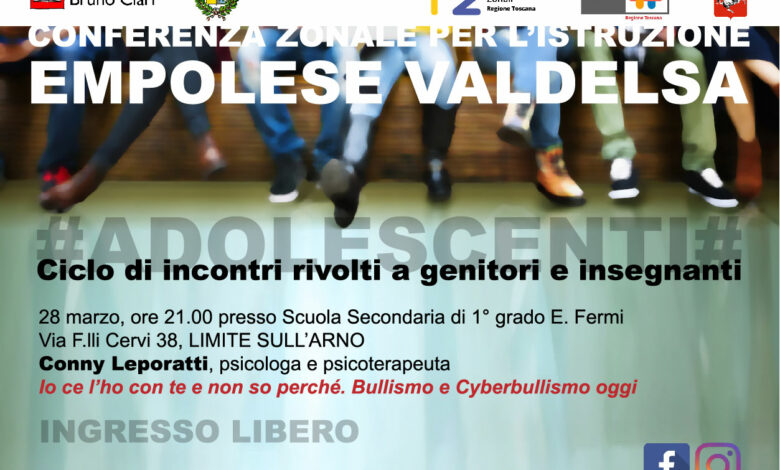 “Bullismo e cyberbullismo oggi”: incontro alla scuola secondaria di Limite giovedì 28 alle 21,00. Interviene la psicologa Conny Leporatti nell’ambito degli appuntamenti a cura della Conferenza zonale dell’Istruzione