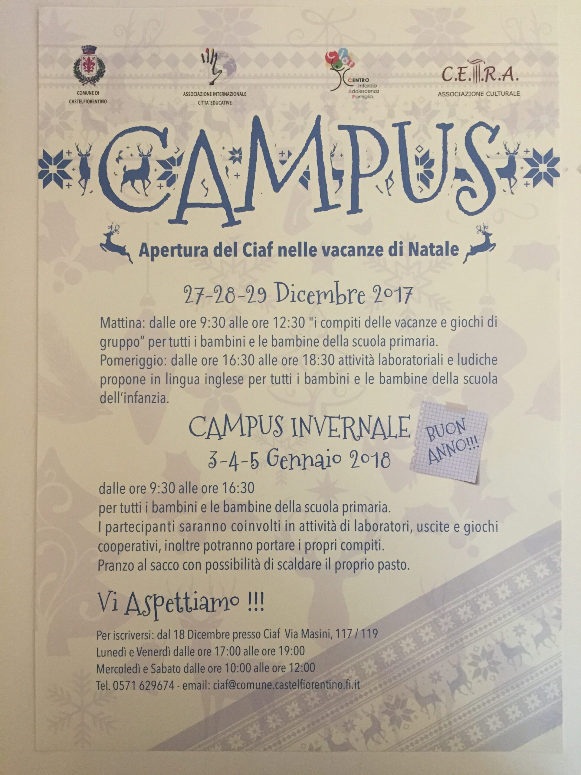 Dopo i festeggiamenti, il Campus invernale riprenderà dal 3 al 5 gennaio con orario full time (ore 9.30-16.30) e alcune attività, riservate ai bambini e bambine della scuola primaria, che spaziano dalle attività di laboratorio alle uscite e giochi cooperativi, fino a poter fare i propri compiti prima della ripresa della normale attività scolastica. Trattandosi di un’apertura che copre l’intera giornata, sarà possibile portare da casa il proprio pasto e di riscaldarlo direttamente al Ciaf.