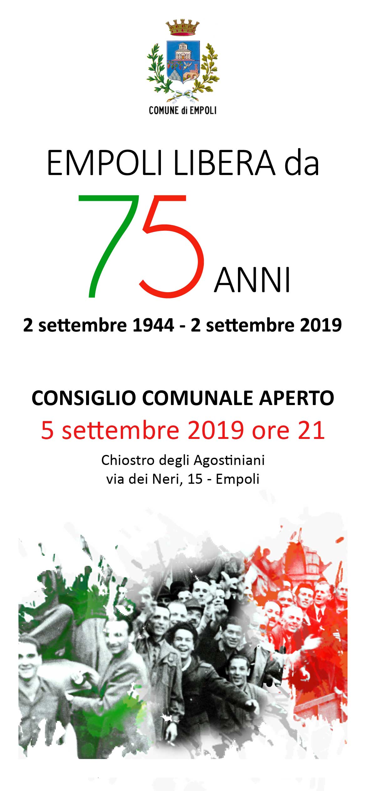 Giovedì 5 settembre alle 21, Convento degli Agostiniani Consiglio Comunale aperto per il “75° anniversario della Liberazione di Empoli” dal…