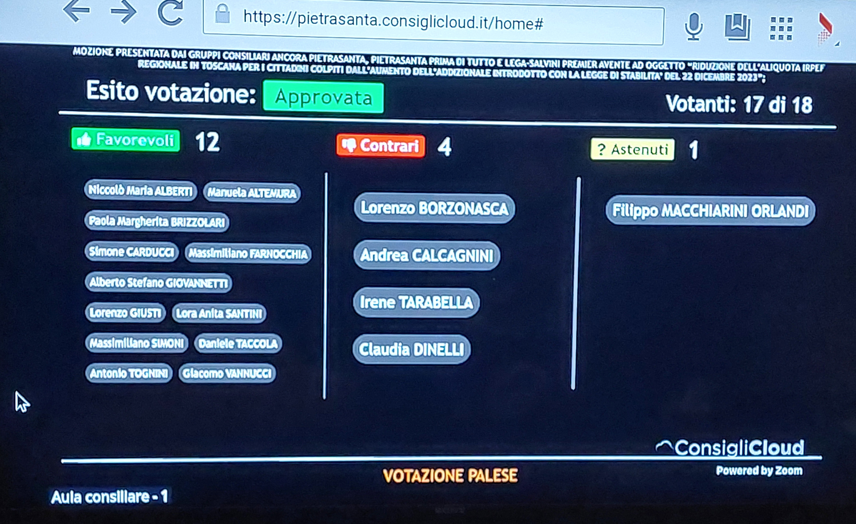Una mozione promossa all’unanimità, una a maggioranza e due respinte nell’ultima seduta del consiglio comunale di Pietrasanta, celebrata lunedì sera, per la prima volta, con lo strumento del voto elettronico. Come spiegato dalla presidente Paola Brizzolari in apertura dei lavori, “da stasera la votazione palese, per alzata di mano, sarà sostituita da quella resa elettronicamente: i consiglieri avranno tre pulsanti a disposizione per esprimere voto favorevole, contrario o di astensione alle varie proposte discusse. Un meccanismo che renderà più immediato e trasparente l’esito dei lavori anche per i cittadini che ci seguono in streaming: alla chiusura di ogni votazione, infatti, una schermata ne certificherà subito il risultato con il dettaglio del voto espresso da ciascun membro dell’assise”.