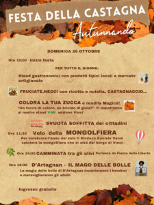 Per domenica 26 ottobre il Centro Commerciale Naturale Vincincentro ha organizzato la Festa della castagna (https://www.comune.vinci.fi.it/vivere-il-comune/eventi/festa-castagna-2025/), con un programma ricco che animerà il centro del Capoluogo per tutto il giorno: dalle 10, Piazza della Libertà e Via Giovanni XXIII ospiteranno stand gastronomici con prodotti tipici locali e un mercato artigianale, oltre all’offerta di dolci stagionali, quali fruciate, necci e castagnaccio.