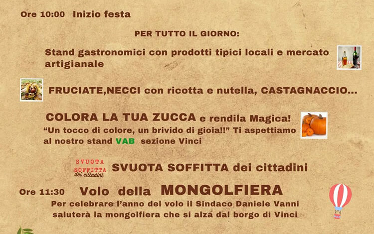 Alle 11.30, Daniele Vanni, sindaco di Vinci, celebrerà l’Anno del volo salutando la mongolfiera che si alzerà dal borgo.