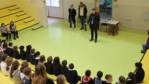 Vanni, Marzocchini e Vezzosi hanno distribuito ai bambini le borracce di alluminio e spiegato loro l’importanza della sostituzione e della riduzione progressiva delle bottiglie di plastica.