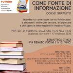 A febbraio via a ‘La biblioteca come fonte di informazione’, per sapere usare i servizi bibliotecari e gli strumenti on line per cercare le informazioni in maniera efficace (una sola lezione, il 24 febbraio dalle 16.30 alle 19.30; scadenza delle iscrizioni il 17 febbraio).