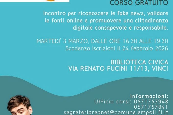 Per informazioni sui corsi, che sono tutti gratuiti, si può chiamare l’ufficio corsi della segreteria REA.net allo 0571757948 o 0571757841, scrivere a segreteriareanet@comune.empoli.fi.it, o ancora chiamare la Biblioteca civica di Vinci allo 0571933263 oppure scrivere a biblioteca@comune.vinci.fi.it.