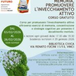 Il 5 febbraio è in partenza ‘Potenziare la memoria, promuovere l’invecchiamento attivo’, un corso per sviluppare e mantenere validi esercizi di memoria e strategie cognitive per prevenire il decadimento mentale (quattro lezioni, ogni giovedì dalle 17.30 alle 19.30; scadenza delle iscrizioni il 29 gennaio).