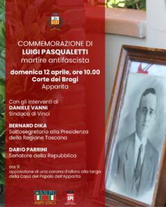Per ricordare Pasqualetti saranno presenti Daniele Vanni, sindaco di Vinci, Mila Chini, assessora con delega ai progetti di valorizzazione della memoria storica e democratica del Comune di Vinci, Dario Parrini, senatore della Repubblica, e Bernard Dika, sottosegretario alla Presidenza della Regione Toscana.