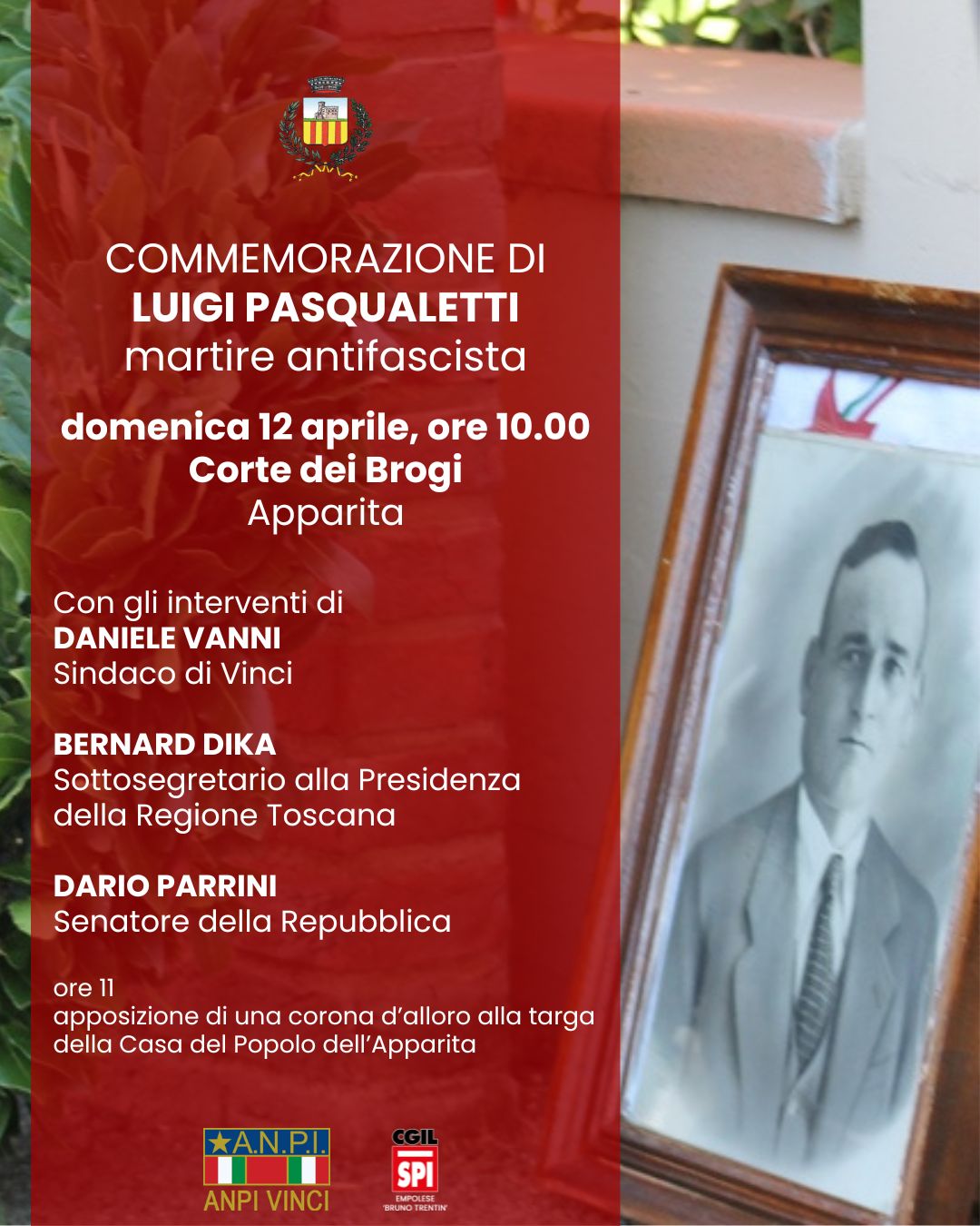 Per ricordare Pasqualetti saranno presenti Daniele Vanni, sindaco di Vinci, Mila Chini, assessora con delega ai progetti di valorizzazione della memoria storica e democratica del Comune di Vinci, Dario Parrini, senatore della Repubblica, e Bernard Dika, sottosegretario alla Presidenza della Regione Toscana.
