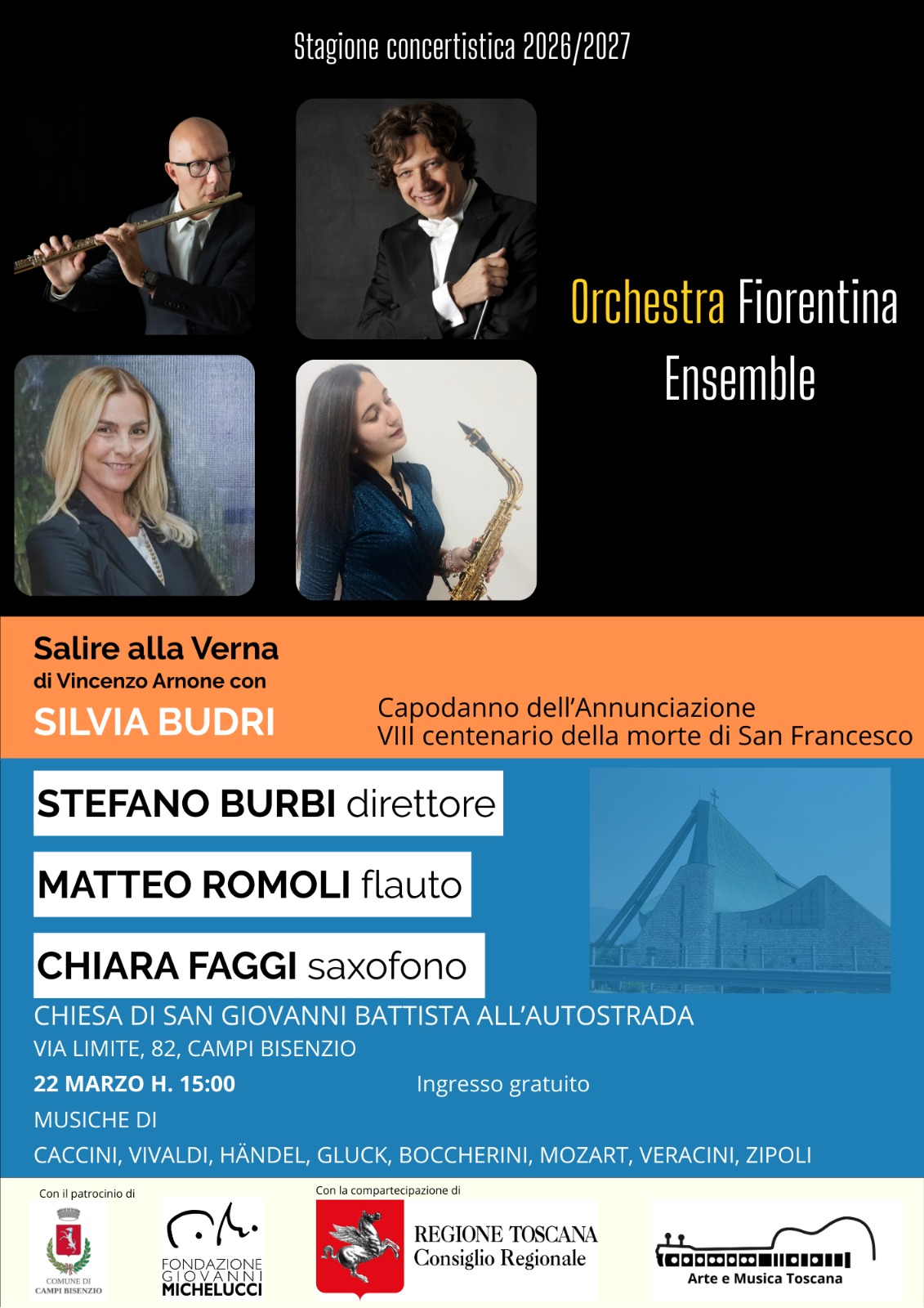 L’evento intende rievocare una significativa tradizione storica della Toscana: dal 1582 al 1749, infatti, l’Anno Nuovo veniva celebrato il 25 marzo, giorno dell’Annunciazione. Tale ricorrenza, oltre al suo significato religioso, coincide con la rinascita della natura e l’inizio della primavera. Le musiche di Caccini, Vivaldi, Händel, Gluck, Boccherini, Mozart, Veracini e Zipoli faranno da intermezzo al poemetto Salire alla Verna di Don Vincenzo Arnone. L’opera, composta in occasione dell’VIII centenario della morte di San Francesco, prevede un particolare risalto musicale alla “Cappella dell’Annunciazione”. La voce recitante sarà affidata a Silvia Budri, attrice di Campi Bisenzio con consolidata esperienza teatrale, cinematografica e televisiva (Cento cuori, Don Matteo, Un medico in famiglia). Flauto solista Matteo Romoli, che collabora con orchestre come i Cameristi del Maggio Musicale Fiorentino, Toscana Classica, Orchestra da Camera Fiorentina, Il Contrappunto e F. Busoni di Empoli  ed è Primo Flauto delle orchestre Fondazione Nuove Assonanze, Nuova Europa e I Filarmonici di Firenze, di cui è stato co-fondatore insieme a Stefano Burbi, esibendosi sotto l’egida del Mozarteum di Salisburgo in seno all’Associazione Mozart Italia. Direttore Stefano Burbi, che durante la sua intensa attività concertistica a livello internazionale è salito sul podio a guidare numerose prestigiose orchestre fra cui la Canadian Chamber Academy, la Toronto Academy Orchestra, l’Orchestra Nova Harmonia, la Antonio Vivaldi Orchestra di Toronto ed è direttore stabile dei Filarmonici di Firenze.