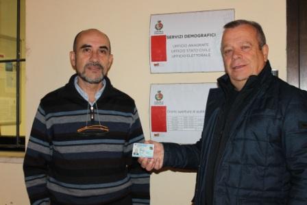 FOTO: da destra, l’assessore Piero Di Vita che ha testato per primo la C.I.E. rinnovando la propria carta d’identità e il responsabile dell’Ufficio Anagrafe Luigi Dani