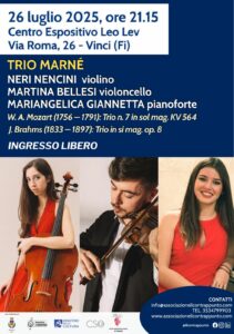 Il trio composto da Neri Nencini (violino), Martina Bellesi (violoncello) e Mariangelica Giannetta (pianoforte) proporrà un repertorio classico d’eccellenza con opere di W.A Mozart e J.Brahms. Una performance elegante, raffinata, che unisce tecnica impeccabile e sensibilità interpretativa per immergere il pubblico nelle melodie senza tempo dei grandi maestri della musica classica.