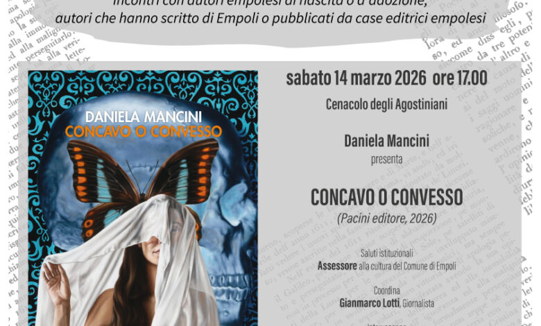 EMPOLI – Appuntamento con il ‘giallo’: Daniela Mancini per il ciclo “Empolichescrive”, sabato 14 marzo 2026, alle 17, presenterà il suo ultimo romanzo giallo intitolato Concavo o Convesso (Pacini editore, 2026), nella bellezza del Cenacolo degli Agostiniani (via dei Neri, 15 Empoli).