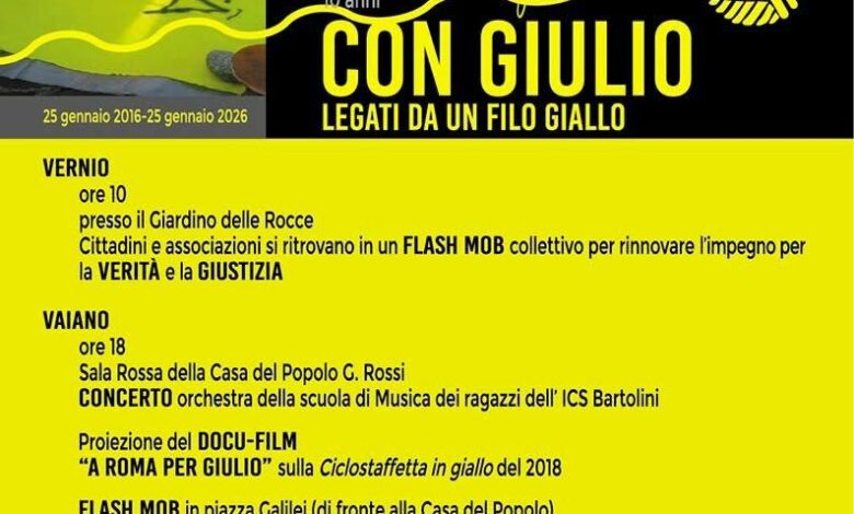 Nel pomeriggio le iniziative proseguiranno a Vaiano: alle ore 18, nella Sala rossa della Casa del popolo “G. Rossi”, si terrà il concerto dell’orchestra della Scuola di musica dei ragazzi dell’Istituto comprensivo Bartolini, seguito dalla proiezione del docu-film “A Roma per Giulio”, dedicato alla ciclo-staffetta in giallo del 2018. A seguire, un flash mob in piazza Galilei, di fronte alla Casa del popolo, e letture dal libro “Giulio fa cose”. Alle ore 19.41, i colpi di un tamburo ricorderanno il momento della scomparsa di Giulio Regeni al Cairo, in un gesto simbolico e collettivo di memoria.