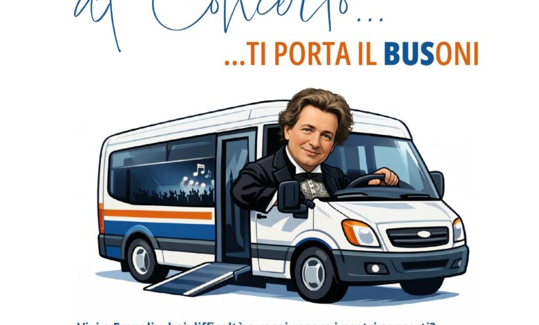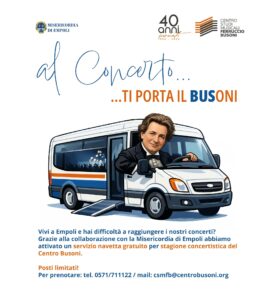 EMPOLI – Il Centro Studi Musicali Ferruccio Busoni attiva il servizio navetta gratuito per i residenti del comune di Empoli. Raggiungere i concerti del Centro Studi Musicali Ferruccio Busoni diventa ancora più semplice grazie al nuovo servizio “Al concerto ti porta il BUSoni”, attivato in collaborazione con la Misericordia di Empoli.