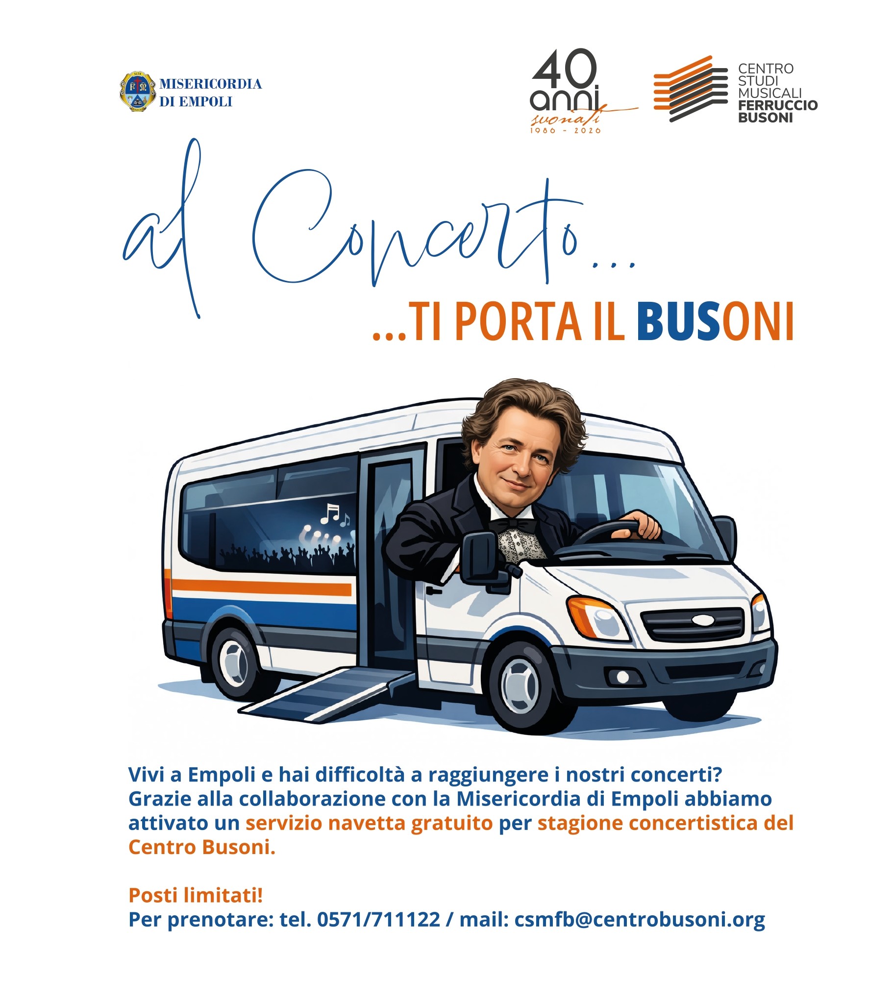 EMPOLI – Il Centro Studi Musicali Ferruccio Busoni attiva il servizio navetta gratuito per i residenti del comune di Empoli. Raggiungere i concerti del Centro Studi Musicali Ferruccio Busoni diventa ancora più semplice grazie al nuovo servizio “Al concerto ti porta il BUSoni”, attivato in collaborazione con la Misericordia di Empoli.