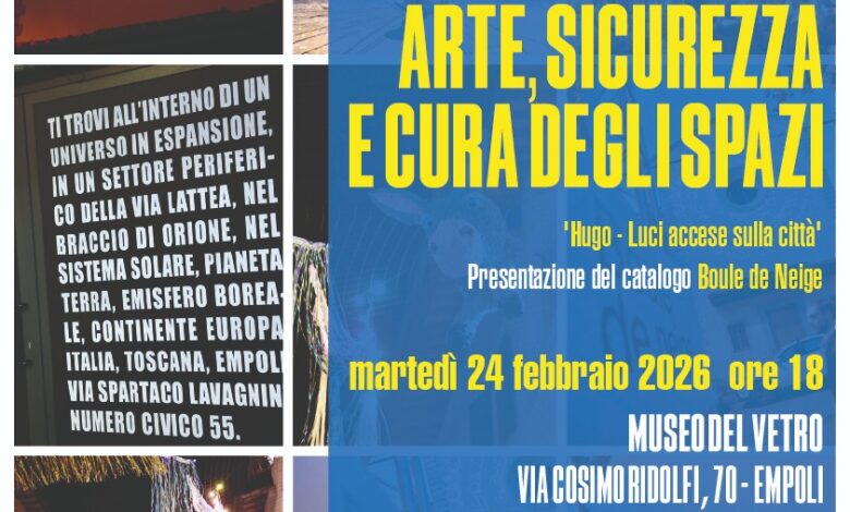 EMPOLI – Arte, sicurezza e cura degli spazi: martedì 24 febbraio 2026 sarà il momento di restituzione e riepilogo del progetto Hugo – Luci accese sulla città. Alle 18 al Museo del Vetro (via Ridolfi, 70) verranno presentate le varie fasi del progetto artistico, culturale e sociale sviluppato sul territorio. L’occasione sarà propizia anche per presentare il catalogo dell’itinerario di arte pubblica e rigenerazione urbana chiamato Boule de Neige, progetto promosso dal Comune di Empoli e curato da Sergio Risaliti e Antonella Nicola.
