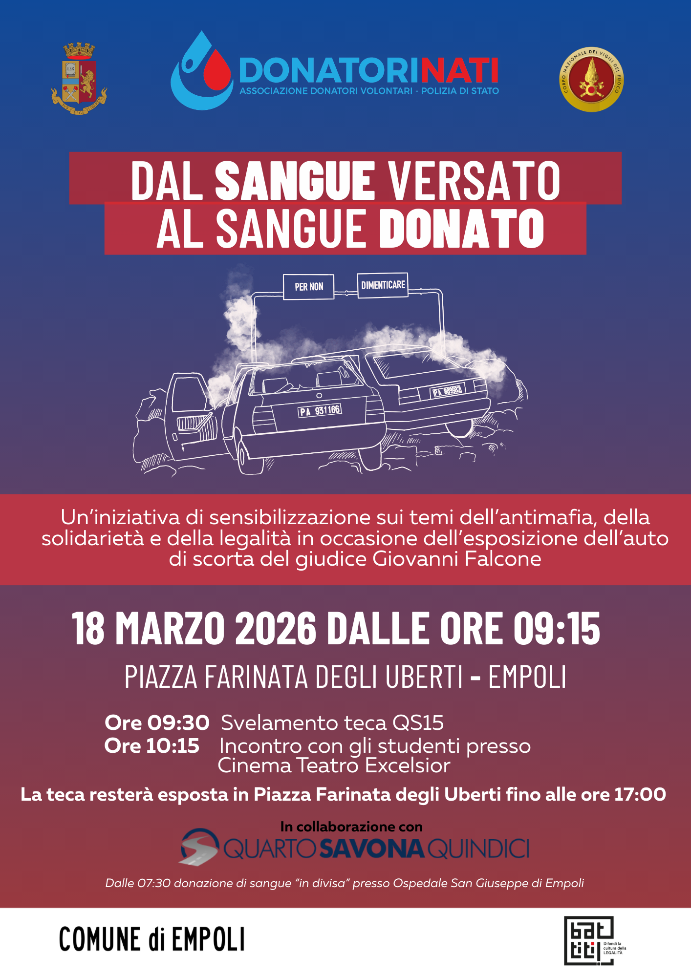 EMPOLI. ‘Dal sangue versato al sangue donato’, modifiche alla viabilità in centro per l’arrivo della teca con i resti dell’auto della scorta di Giovanni Falcone