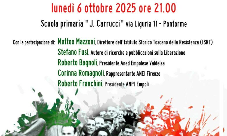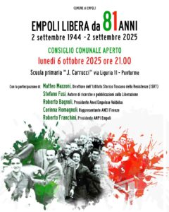 EMPOLI – Sarà un momento pubblico aperto per commemorare con tutti gli onori Empoli libera dall’occupazione nazifascista da 81 anni. Per ricordare e condividere la memoria storica, è stato convocato un Consiglio comunale aperto alla cittadinanza che si terrà lunedì 6 ottobre 2025, alle 21, nei locali della scuola primaria ‘J.Carrucci’ (via Liguria, 11) a Pontorme.
