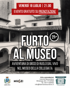 EMPOLI – Venerdì 18 luglio a partire dalle 21 il Museo della Collegiata di Empoli in piazzetta della Propositura diventerà la scena di un crimine: si chiama Furto al Museo il prossimo appuntamento con il gioco di ruolo dal vivo, stavolta in versione estiva.