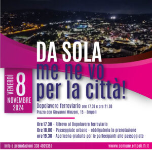 Il progetto delle passeggiate denominato “Da sola me ne vo per la città”, è promosso dal Comune di Empoli, HUGO (Human Geography Organizer) e Sociolab. L’iniziativa è finalizzata ad esplorare temi e aspetti legati alla fruizione dello spazio pubblico da parte delle donne e di quanto si sentano ‘sicure’.