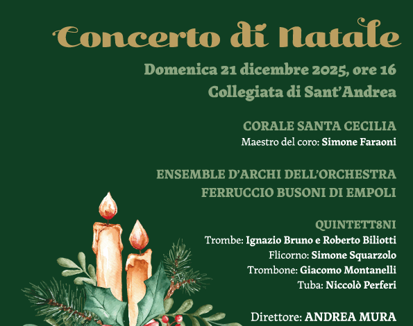 La Corale Santa Cecilia, preparata da Simone Faraoni, l’ensemble d’archi dell’Orchestra Ferruccio Busoni di Empoli e i Quintett8ni (trombe: Ignazio Bruno, Roberto Biliotti; flicorno: Simone Squarzolo; trombone: Giacomo Montanelli; tuba: Niccolò Perferi) daranno vita al consueto appuntamento musicale natalizio.