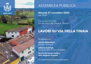 Per fare il punto della situazione nei confronti dei residenti della frazione, è stata indetta un’assemblea pubblica al circolo Arci della Tinaia giovedì 27 novembre alle ore 18.30. Saranno presenti il sindaco Alessio Mantellassi, la dirigente del Servizio Lavori Pubblici e Patrimonio, Roberta Scardigli, oltre ai tecnici del Genio Civile e della Regione Toscana, enti titolari dei lavori.