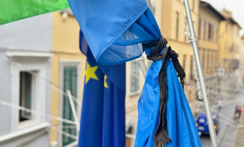 EMPOLI. Per i diritti della Palestina, bandiera del Comune listata a lutto