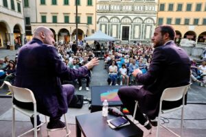 CARLO GREPPI – Photo credit Francesca Leonardi e una foto di ‘archivio’ dell’edizione 2025 dell’apertura del festival con il dialogo tra Carlo Greppi e Alessandro Vanoli.