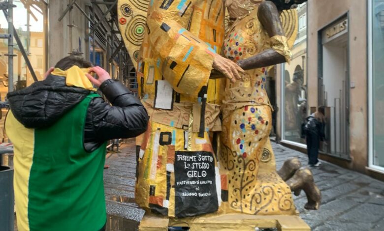 In centro a far colore e ben visibili le quattro installazioni del maestro Umberto Cinquini – al Carnevale di Viareggio è presente con un’opera realizzata insieme ai fratelli Michele e Stefano con il carro allegorico intitolato ‘Nemmeno con un fiore’ -.