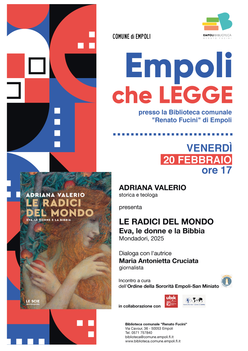 EMPOLI – Un nuovo appuntamento con “Empoli che Legge”: ospite della rassegna Adriana Valerio. Storica e teologa presenterà il libro Le radici del mondo. Eva, le donne e la Bibbia (Mondadori, 2025), venerdì 20 febbraio 2026, alle 17, alla biblioteca comunale Renato Fucini di Empoli (via Cavour, 36). L’ingresso è libero. Dialogherà con l’autrice, Maria Antonietta Cruciata, giornalista. L’incontro è a cura dell’Ordine della Sororità Empoli-San Miniato e realizzato in collaborazione con Libreria Rinascita e Fidapa.