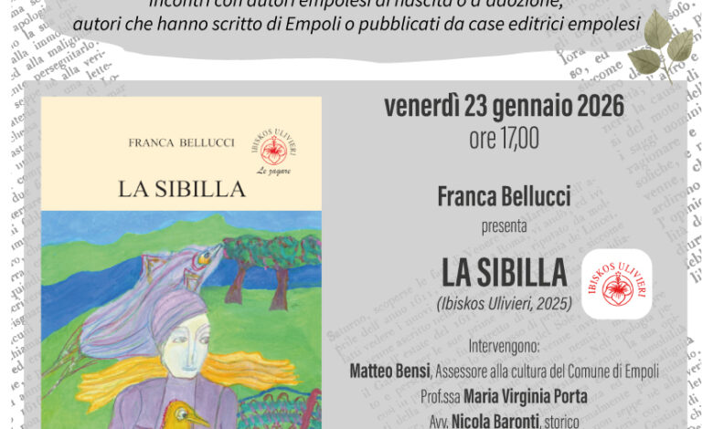 EMPOLI – Un nuovo appuntamento per il ciclo “Empolichescrive” si terrà venerdì 23 gennaio 2026, alle 17, ad ingresso libero alla biblioteca comunale Renato Fucini di Empoli (via Cavour, 36). Ospite Franca Bellucci che presenterà il suo libro intitolato La Sibilla (Ibiskos Ulivieri, 2025).
