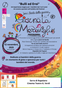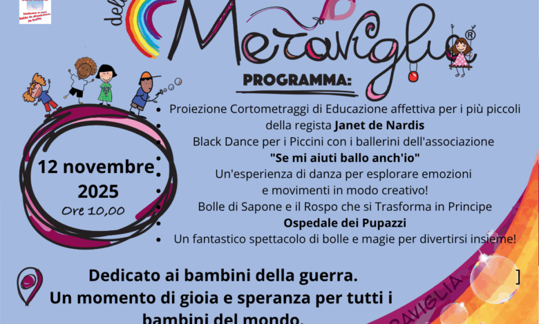 Il 12 novembre segna l’inizio della seconda parte del Festival – che ha preso avvio con il Convegno dedicato agli adolescenti svoltosi a Montepulciano nei giorni 10-11 ottobre scorsi- con una giornata speciale: “La Giornata della Meraviglia”, dedicata ai bambini della guerra, con attività pensate per la fascia d’età 3–5 anni, a partire dalle ore 10,00 al Cinema Teatro G. Verdi di Serre di Rapolano (via dell’Orlo 6).