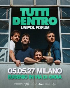 Il 5 maggio 2027 gli EUGENIO IN VIA DI GIOIA saliranno per la prima volta sul palco dell’Unipol Forum di Assago per il loro concerto evento TUTTI DENTRO, prodotto da A1 Concerti.