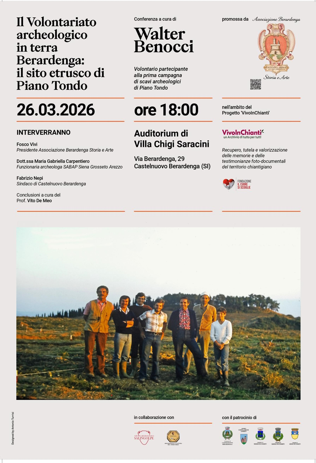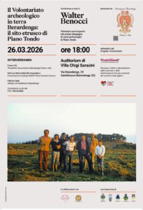 Giovedì 26 marzo 2026 alle ore 18.00, presso l’Auditorium di Villa Chigi Saracini a Castelnuovo Berardenga, si terrà la conferenza “Il volontariato archeologico in terra Berardenga: il sito etrusco di Piano Tondo”, a cura di Walter Benocci, volontario che partecipò alla prima campagna di scavi archeologici diretti dalla dott.ssa Talocchini.