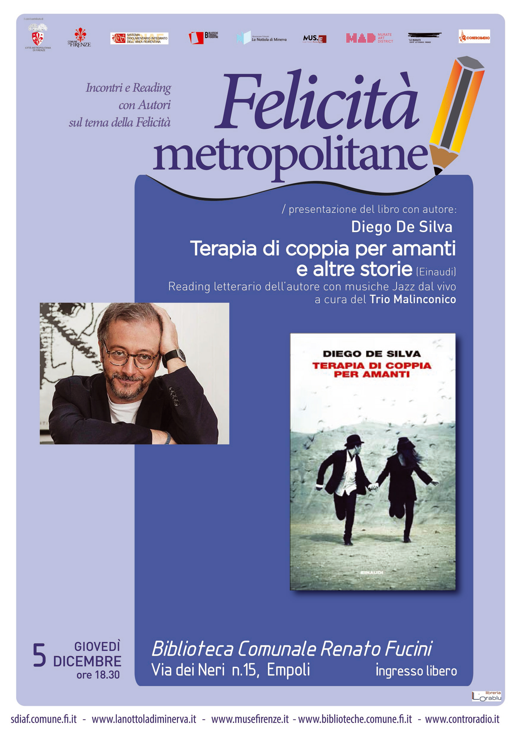 Giovedì 5 dicembre 2019 alle 18.30, alla biblioteca comunale ‘Renato Fucini’, all’interno del Cenacolo degli Agostiniani, ci sarà Diego De Silva con il suo libro intitolato ‘Terapia di coppia per amanti e altre storie’, Enaudi. L’ingresso è libero.