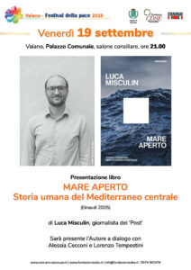 Vaiano, 17 settembre 2025 – Prosegue il Festival della Pace, iniziativa ideata e organizzata da Comune di Vaiano, Fondazione CDSE e Anpi Vaiano, con un nuovo appuntamento in programma a Vaiano venerdì 19 settembre alle ore 21, nel salone consiliare del Palazzo comunale. Protagonista della serata sarà il giornalista del Post Luca Misculin, che presenterà il suo ultimo libro Mare aperto. Storia umana del Mediterraneo centrale (Einaudi, 2025). Dopo i saluti istituzionali, l’autore dialogherà con il giornalista e podcaster pratese Lorenzo Tempestini e con Alessia Cecconi, direttrice della Fondazione CDSE.