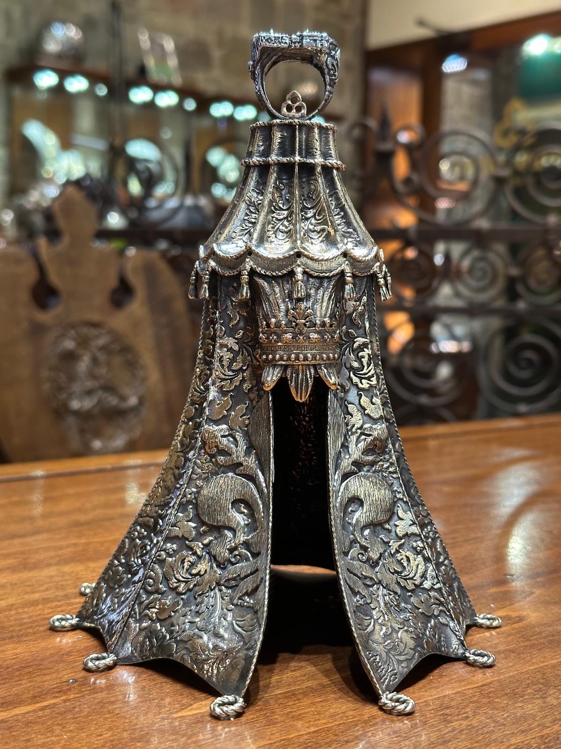 L’anello poggia su un basamento in bronzo, realizzato a forma di tenda a padiglione fiorentina, ispirata a un particolare del manoscritto di Niccolò di Ventura “La Battaglia di Montaperti” (metà XV secolo), conservato nella Biblioteca comunale degli Intronati di Siena. La superficie della base è impreziosita da motivi damascati, dai quali emergono il Giglio di Firenze e la corona del Marzocco, elementi simbolo della tradizione civica fiorentina.