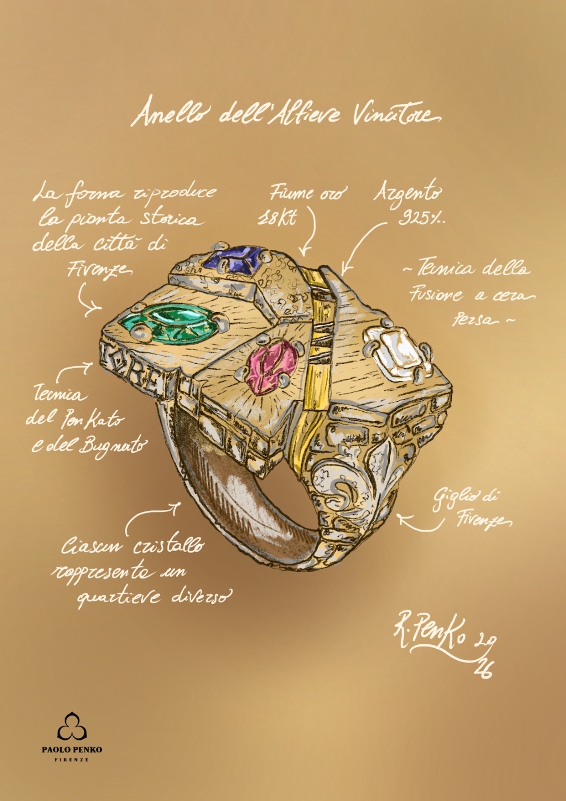 L’Anello dell’Alfiere Vincitore, realizzato dalla Bottega Orafa Paolo Penko è un gioiello in argento, per il quale è stata usata l’antica tecnica della fusione a cera persa. È stato quindi cesellato a mano e inciso a bulino, secondo l’antica tradizione orafa fiorentina. L’opera è ulteriormente impreziosita grazie all’esclusiva tecnica del penkato e del bugnato.