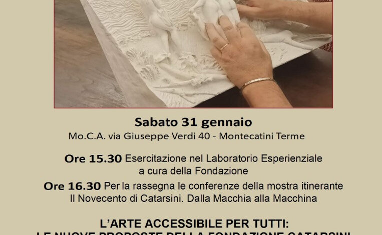 Questi i momenti salienti del pomeriggio: prima di tutto alle ore 15.30 è prevista l’esercitazione nel Laboratorio Esperienziale allestito dalla Fondazione Catarsini negli spazi della mostra montecatinese (oltre a questo temporaneo ve ne sono altri quattro permanenti lungo il percorso del Cammino I luoghi di Catarsini); la dimostrazione è aperta a tutti e sarà condotta da Paola Olivieri (socia UICI e vice presidente provinciale I.Ri.Fo.R. sezioni di Lucca, membro del Comitato scientifico Fondazione Catarsini responsabile progetto ‘L’arte accessibile per tutti’) insieme ad alcuni soci dell’Unione Italiana dei Ciechi e degli Ipovedenti della sezione di Pistoia con il Presidente, Virgilio Rapanelli. Il Laboratorio Esperienziale è frutto della metodica che affronta la disabilità sensoriale con un approccio olistico che considera non solo le esigenze fisiche, ma anche quelle emotive e sociali per garantire a tutti i visitatori, comprese appunto le persone con disabilità visiva, la possibilità di interagire con l’arte attraverso il tatto e l’udito al fine di conciliare l’accessibilità con la fruizione e la conservazione del patrimonio culturale.