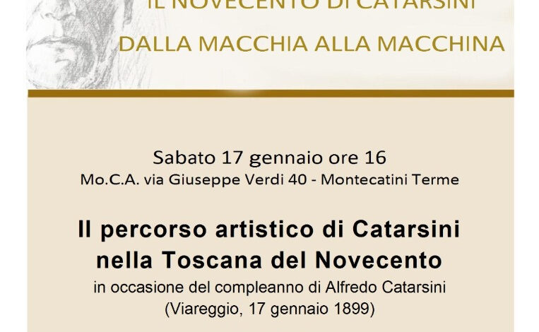 Sabato 17 gennaio, alle ore 16, interverranno infatti allโincontro dal titolo โIl percorso artistico di Catarsini nella Toscana del Novecentoโ al Mo.C.A. – Montecatini Terme Contemporary Art – spazio espositivo dedicato all’arte moderna e contemporanea situato all’interno del Palazzo Comunale della cittร termale โ dove si sta svoilgendo la mostra Il Novecento di Catarsini. Dalla macchia alla macchina, quarta tappa (dopo Firenze, Viareggio e Pisa) dellโesposizione itinerante a cura della Fondazione Alfredo Catarsini 1899 ETS, il cui progetto espositivo รจ promosso e realizzato in collaborazione con lโAssessorato alla Cultura del Comune di Montecatini Terme.