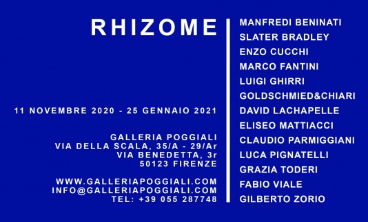 Da domani, mercoledì 11 novembre 2020, fino al 25 gennaio 2021, la Galleria Poggiali di Firenze propone Rhizome, una selezione di opere degli artisti della galleria che, sulla scia del concetto elaborato dai filosofi francesi Deleuze e Guattari di Rhizome, si interconnettono attraverso una relazione di carattere orizzontale priva della necessità di un centro, nella quale ogni elemento è funzionale al processo, priva di determinazioni gerarchiche proprie di un sistema verticale ad albero. Si tratta di un percorso che si snoda nello spazio della Galleria Poggiali in via della Scala 35 Ar, a Firenze, attraverso le opere di 13 autori.